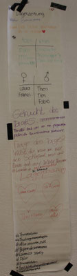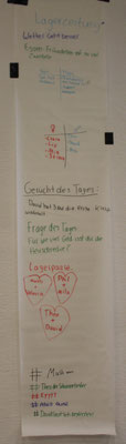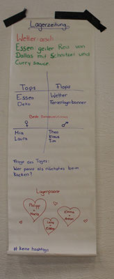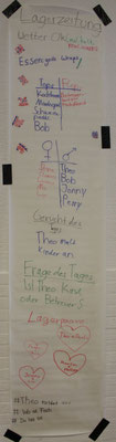 Jeden Tag hat ein Gruppentisch die ehrenvolle Aufgabe, eine Lagerzeitung auf einer Tapete zu erstellen, die beim Abendessen den anderen Kindern vorgestellt wird. Dieses machen wir bereits seit Jahren. Die Kinder finden die Lagerzeitungen toll und freuen sich, wenn sie an der Reihe sind, diese zu entwerfen.